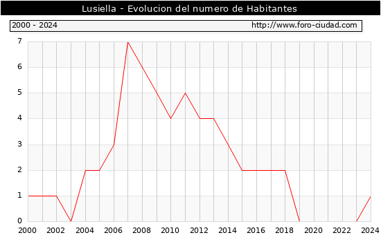 el numero de habitantes en Lusiella era de 1, 1 habitantes mas que el en el año 2023. En el grafico siguiente se puede ver cuantos habitantes tiene Lusiella a lo largo de los años.