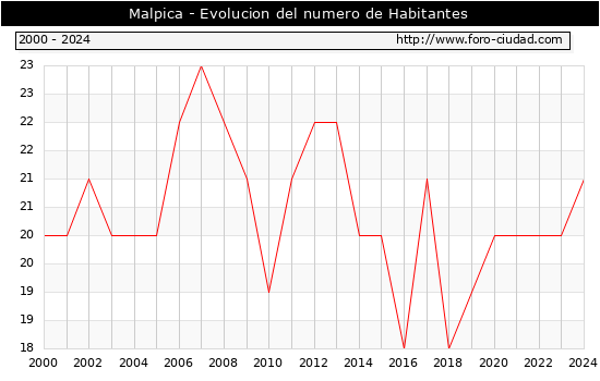 el numero de habitantes en Malpica era de 21, 1 habitantes mas que el en el año 2023. En el grafico siguiente se puede ver cuantos habitantes tiene Malpica a lo largo de los años.