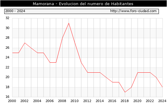 el numero de habitantes en Mamorana era de 18, 2 habitantes menos que el en el año 2023. En el grafico siguiente se puede ver cuantos habitantes tiene Mamorana a lo largo de los años.