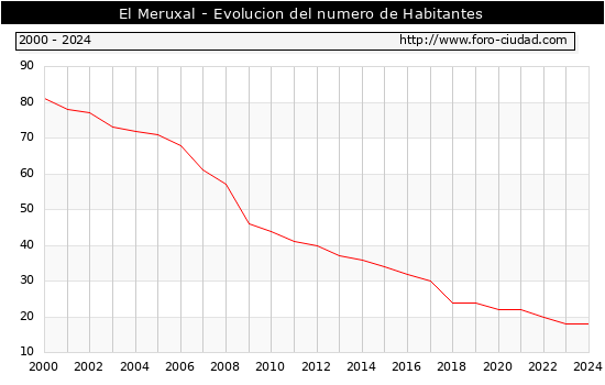 el numero de habitantes en El Meruxal era de 18, igual numero de habitantes que el en el año 2023. En el grafico siguiente se puede ver cuantos habitantes tiene El Meruxal a lo largo de los años.
