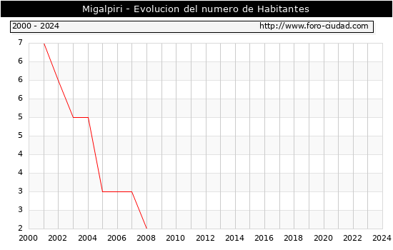 el numero de habitantes en Migalpiri era de 2, igual numero de habitantes que el en el año 2023. En el grafico siguiente se puede ver cuantos habitantes tiene Migalpiri a lo largo de los años.