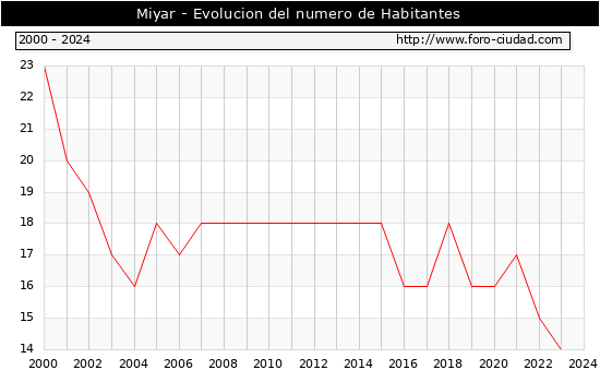 el numero de habitantes en Miyar era de 14, igual numero de habitantes que el en el año 2023. En el grafico siguiente se puede ver cuantos habitantes tiene Miyar a lo largo de los años.