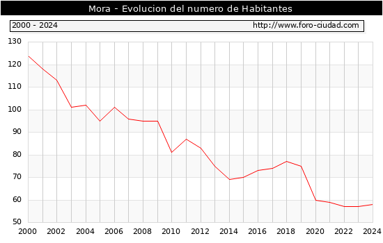 el numero de habitantes en Mora era de 58, 1 habitantes mas que el en el año 2023. En el grafico siguiente se puede ver cuantos habitantes tiene Mora a lo largo de los años.