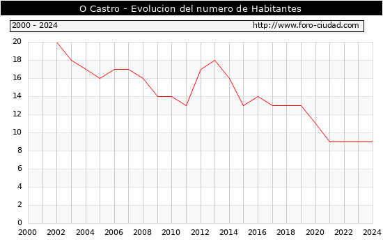 el numero de habitantes en O Castro era de 9, igual numero de habitantes que el en el año 2023. En el grafico siguiente se puede ver cuantos habitantes tiene O Castro a lo largo de los años.