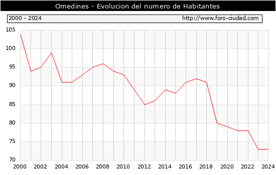 el numero de habitantes en Omedines era de 73, igual numero de habitantes que el en el año 2023. En el grafico siguiente se puede ver cuantos habitantes tiene Omedines a lo largo de los años.