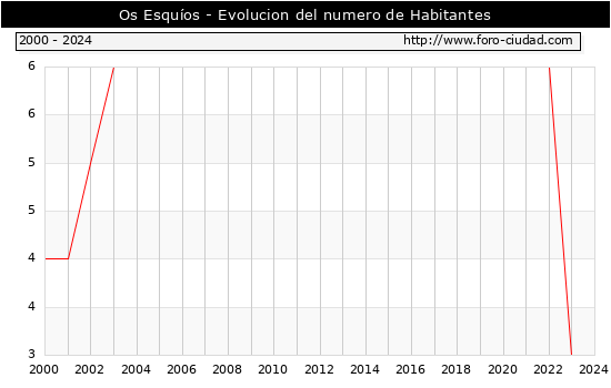 el numero de habitantes en Os Esquíos era de 3, igual numero de habitantes que el en el año 2023. En el grafico siguiente se puede ver cuantos habitantes tiene Os Esquíos a lo largo de los años.
