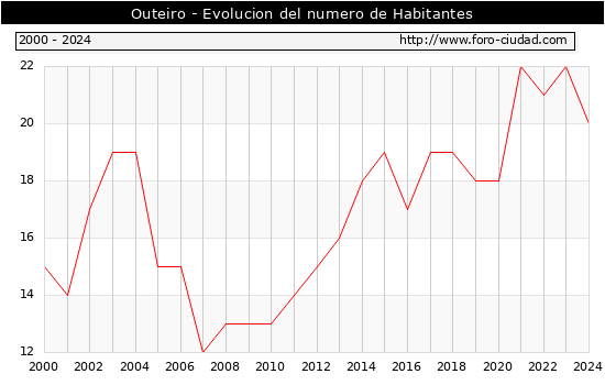 el numero de habitantes en Outeiro era de 20, 2 habitantes menos que el en el año 2023. En el grafico siguiente se puede ver cuantos habitantes tiene Outeiro a lo largo de los años.