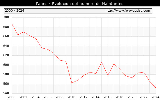 el numero de habitantes en Panes era de 552, 13 habitantes menos que el en el año 2023. En el grafico siguiente se puede ver cuantos habitantes tiene Panes a lo largo de los años.