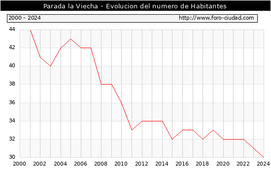 el numero de habitantes en Parada la Viecha era de 30, 1 habitantes menos que el en el año 2023. En el grafico siguiente se puede ver cuantos habitantes tiene Parada la Viecha a lo largo de los años.