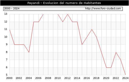el numero de habitantes en Payandi era de 5, 2 habitantes menos que el en el año 2023. En el grafico siguiente se puede ver cuantos habitantes tiene Payandi a lo largo de los años.