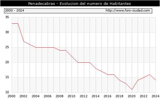 el numero de habitantes en Penadecabras era de 14, 2 habitantes menos que el en el año 2023. En el grafico siguiente se puede ver cuantos habitantes tiene Penadecabras a lo largo de los años.