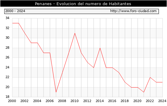el numero de habitantes en Penanes era de 21, igual numero de habitantes que el en el año 2023. En el grafico siguiente se puede ver cuantos habitantes tiene Penanes a lo largo de los años.