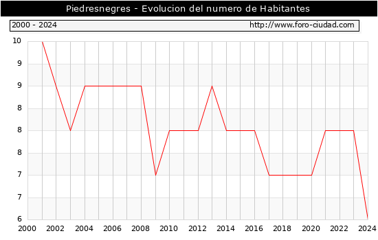 el numero de habitantes en Piedresnegres era de 6, 2 habitantes menos que el en el año 2023. En el grafico siguiente se puede ver cuantos habitantes tiene Piedresnegres a lo largo de los años.