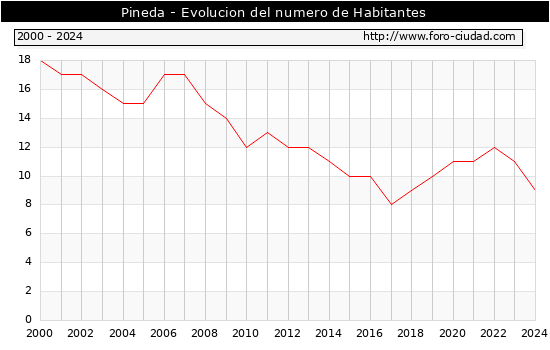 el numero de habitantes en Pineda era de 9, 2 habitantes menos que el en el año 2023. En el grafico siguiente se puede ver cuantos habitantes tiene Pineda a lo largo de los años.