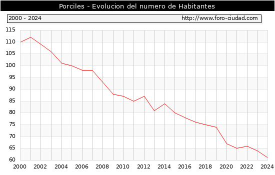 el numero de habitantes en Porciles era de 61, 3 habitantes menos que el en el año 2023. En el grafico siguiente se puede ver cuantos habitantes tiene Porciles a lo largo de los años.