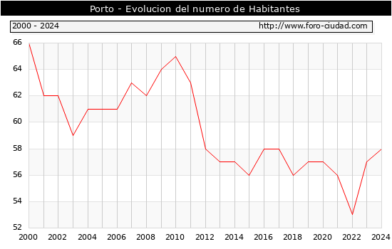 el numero de habitantes en Porto era de 58, 1 habitantes mas que el en el año 2023. En el grafico siguiente se puede ver cuantos habitantes tiene Porto a lo largo de los años.