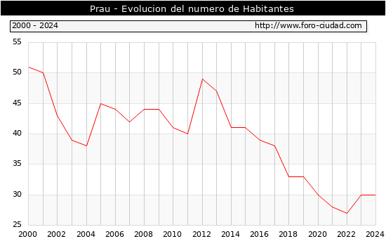 el numero de habitantes en Prau era de 30, igual numero de habitantes que el en el año 2023. En el grafico siguiente se puede ver cuantos habitantes tiene Prau a lo largo de los años.