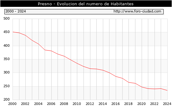 el numero de habitantes en Presno era de 235, 6 habitantes menos que el en el año 2023. En el grafico siguiente se puede ver cuantos habitantes tiene Presno a lo largo de los años.