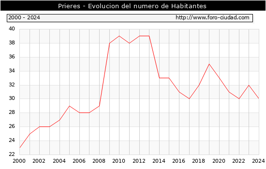 el numero de habitantes en Prieres era de 30, 2 habitantes menos que el en el año 2023. En el grafico siguiente se puede ver cuantos habitantes tiene Prieres a lo largo de los años.