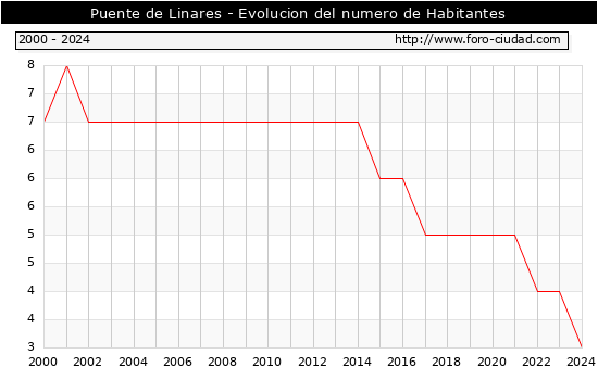 Segun los datos publicados por el INE a 1 de Enero de 2024 el numero de habitantes en Puente de Linares era de 3, 1 habitantes menos que el en el año 2023. En el grafico siguiente se puede ver cuantos habitantes tiene Puente de Linares a lo largo de los años.