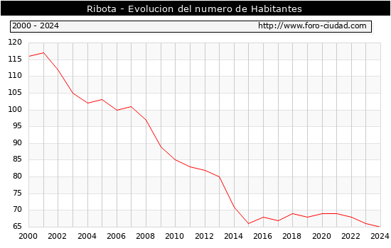 el numero de habitantes en Ribota era de 65, 1 habitantes menos que el en el año 2023. En el grafico siguiente se puede ver cuantos habitantes tiene Ribota a lo largo de los años.