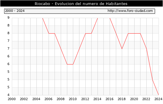 el numero de habitantes en Riocabo era de 4, 1 habitantes menos que el en el año 2023. En el grafico siguiente se puede ver cuantos habitantes tiene Riocabo a lo largo de los años.