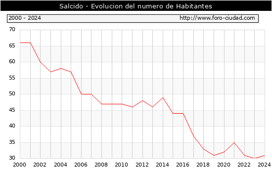 el numero de habitantes en Salcido era de 31, 1 habitantes mas que el en el año 2023. En el grafico siguiente se puede ver cuantos habitantes tiene Salcido a lo largo de los años.