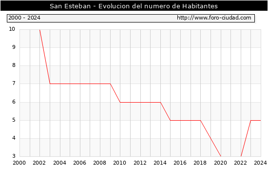 el numero de habitantes en San Esteban era de 5, igual numero de habitantes que el en el año 2023. En el grafico siguiente se puede ver cuantos habitantes tiene San Esteban a lo largo de los años.