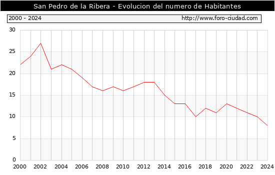 el numero de habitantes en San Pedro de la Ribera era de 8, 2 habitantes menos que el en el año 2023. En el grafico siguiente se puede ver cuantos habitantes tiene San Pedro de la Ribera a lo largo de los años.