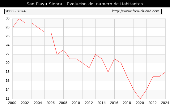 el numero de habitantes en San Playu Sienra era de 18, 1 habitantes mas que el en el año 2023. En el grafico siguiente se puede ver cuantos habitantes tiene San Playu Sienra a lo largo de los años.