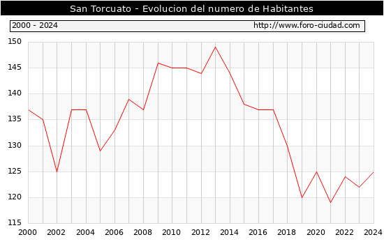 el numero de habitantes en San Torcuato era de 125, 3 habitantes mas que el en el año 2023. En el grafico siguiente se puede ver cuantos habitantes tiene San Torcuato a lo largo de los años.