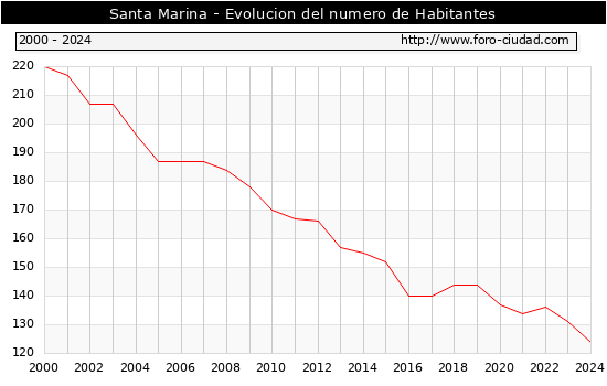 el numero de habitantes en Santa Marina era de 124, 7 habitantes menos que el en el año 2023. En el grafico siguiente se puede ver cuantos habitantes tiene Santa Marina a lo largo de los años.