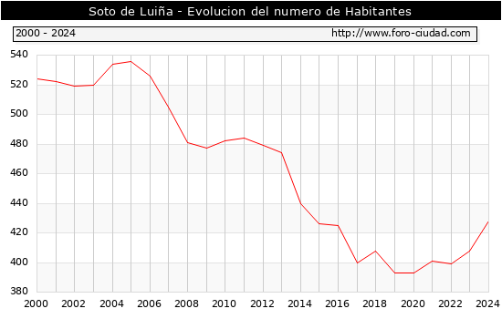 el numero de habitantes en Soto de Luiña era de 428, 20 habitantes mas que el en el año 2023. En el grafico siguiente se puede ver cuantos habitantes tiene Soto de Luiña a lo largo de los años.