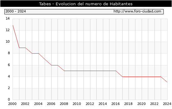 el numero de habitantes en Tabes era de 3, 1 habitantes menos que el en el año 2023. En el grafico siguiente se puede ver cuantos habitantes tiene Tabes a lo largo de los años.