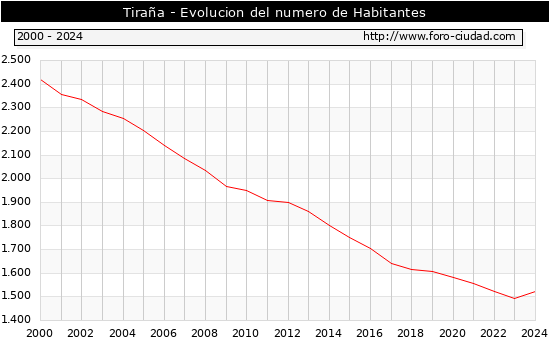 el numero de habitantes en Tiraña era de 1.523, 28 habitantes mas que el en el año 2023. En el grafico siguiente se puede ver cuantos habitantes tiene Tiraña a lo largo de los años.