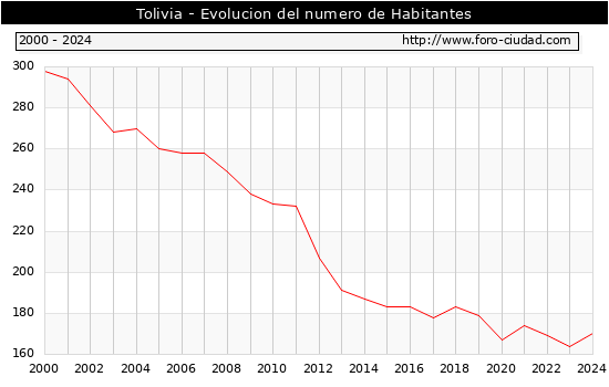 el numero de habitantes en Tolivia era de 170, 6 habitantes mas que el en el año 2023. En el grafico siguiente se puede ver cuantos habitantes tiene Tolivia a lo largo de los años.