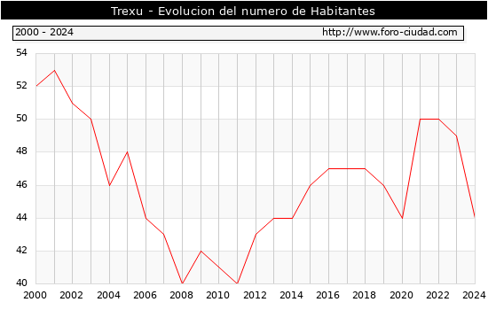 el numero de habitantes en Trexu era de 44, 5 habitantes menos que el en el año 2023. En el grafico siguiente se puede ver cuantos habitantes tiene Trexu a lo largo de los años.