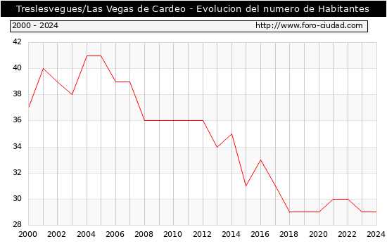 el numero de habitantes en Treslesvegues/Las Vegas de Cardeo era de 29, igual numero de habitantes que el en el año 2023. En el grafico siguiente se puede ver cuantos habitantes tiene Treslesvegues/Las Vegas de Cardeo a lo largo de los años.