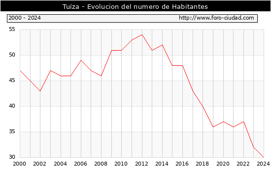 el numero de habitantes en Tuíza era de 30, 2 habitantes menos que el en el año 2023. En el grafico siguiente se puede ver cuantos habitantes tiene Tuíza a lo largo de los años.