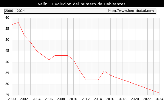 el numero de habitantes en Valín era de 26, 1 habitantes menos que el en el año 2023. En el grafico siguiente se puede ver cuantos habitantes tiene Valín a lo largo de los años.