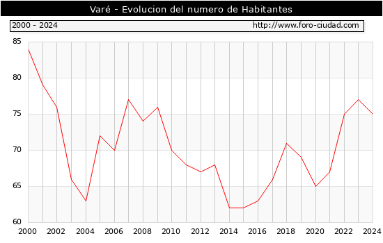 el numero de habitantes en Varé era de 75, 2 habitantes menos que el en el año 2023. En el grafico siguiente se puede ver cuantos habitantes tiene Varé a lo largo de los años.