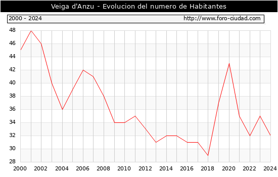 el numero de habitantes en Veiga d'Anzu era de 32, 3 habitantes menos que el en el año 2023. En el grafico siguiente se puede ver cuantos habitantes tiene Veiga d'Anzu a lo largo de los años.