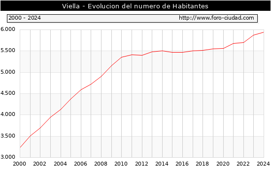 el numero de habitantes en Viella era de 5.937, 69 habitantes mas que el en el año 2023. En el grafico siguiente se puede ver cuantos habitantes tiene Viella a lo largo de los años.