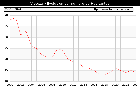 el numero de habitantes en Viscozá era de 14, 1 habitantes menos que el en el año 2023. En el grafico siguiente se puede ver cuantos habitantes tiene Viscozá a lo largo de los años.