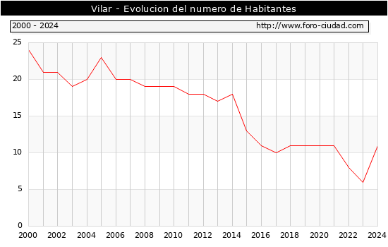 el numero de habitantes en Vilar era de 11, 5 habitantes mas que el en el año 2023. En el grafico siguiente se puede ver cuantos habitantes tiene Vilar a lo largo de los años.