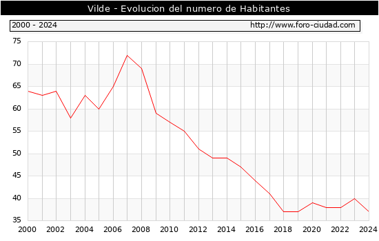 el numero de habitantes en Vilde era de 37, 3 habitantes menos que el en el año 2023. En el grafico siguiente se puede ver cuantos habitantes tiene Vilde a lo largo de los años.