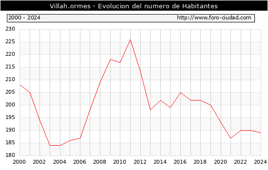 el numero de habitantes en Villah.ormes era de 189, 1 habitantes menos que el en el año 2023. En el grafico siguiente se puede ver cuantos habitantes tiene Villah.ormes a lo largo de los años.