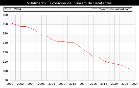 el numero de habitantes en Villalmarzo era de 96, 6 habitantes menos que el en el año 2023. En el grafico siguiente se puede ver cuantos habitantes tiene Villalmarzo a lo largo de los años.