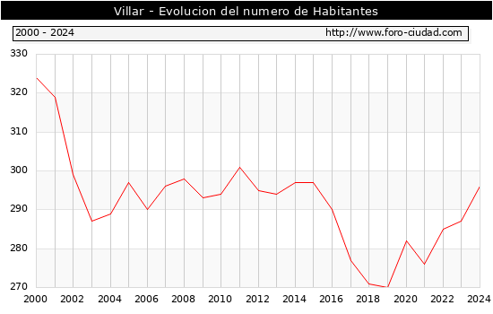 el numero de habitantes en Villar era de 296, 9 habitantes mas que el en el año 2023. En el grafico siguiente se puede ver cuantos habitantes tiene Villar a lo largo de los años.