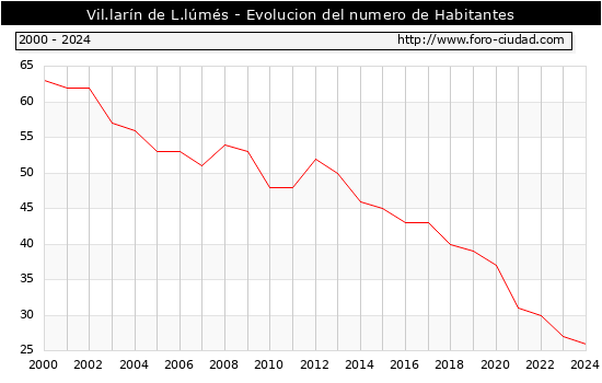 el numero de habitantes en Vil.larín de L.lúmés era de 26, 1 habitantes menos que el en el año 2023. En el grafico siguiente se puede ver cuantos habitantes tiene Vil.larín de L.lúmés a lo largo de los años.